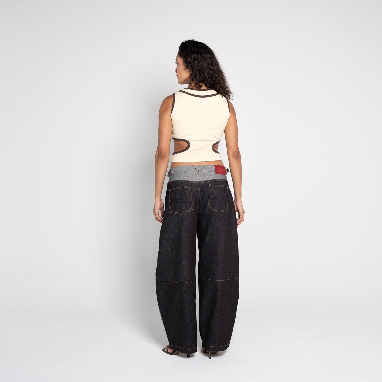 Mid-rise denim jeans in dark navy with a wide rounded-leg silhouette. Designed with defined volume and a clean hem for a contemporary look.